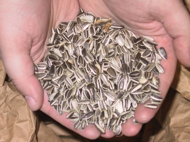 Beim Kauf von Sonnenblumenkernen verlangen Sie immer die Großen und drücken Sie ein paar Kerne zwischen den Fingern. Sie merken dann ob die Kerne leer oder voll sind. Auch hier lohnt sich der Kauf von 25 kg Säcken. Die Kerne werden nicht schlecht, wenn man diese trocken im Keller lagert. Ich mische diese wie folgt: zwei Teile weiß ein Teil gestreift.