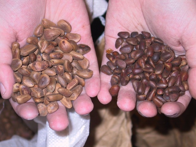 Bei den hier abgebildeten Zirbel (Nüssen) handelt es sich um die große und kleine Sorte. Da diese Nüsse sehr teuer sind lohnt es sich gleich ein 25 kg Sack zu kaufen. Bei den Großen kommt es vor das viele taube Nüsse dabei sind. Ich kontrolliere vor Ort indem ich 10-20 Stück mit einer Zange öffne. Da die Tiere unterschiedlicher Meinung sind, füttere ich 50 zu 50% Bei den Kleineren habe ich noch keine Schlechten bekommen.